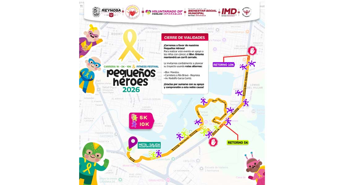 Reynosa, Tam.- El Gobierno Municipal de Reynosa avisa a los automovilistas en general, que, mañana domingo 15 de febrero se celebrará la Carrera 1K, 5K y 10K Fitness Festival Pequeños Héroes 2026, en el Bulevar Oriente, por lo cual un carril de esta vía estará cerrada a la circulación durante el desarrollo del evento.