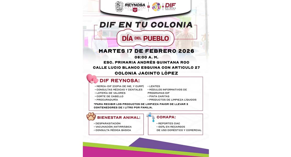 Reynosa, Tam.- El Sistema DIF-Reynosa que preside Carlos Luis Peña Garza, realizará la brigada «DIF en Tu Colonia», con el propósito de acercar los diversos servicios gratuitos a las familias de la colonia Jacinto López.