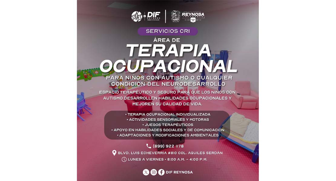Reynosa, Tam.- Con el objetivo de fortalecer habilidades esenciales para su vida diaria, el Sistema DIF-Reynosa que preside Carlos Luis Peña Garza, cuenta con el área de Terapia Ocupacional en el Centro de Rehabilitación Integral, un espacio orientado a apoyar a niñas y niños dentro del Trastorno del Espectro Autista, y con alguna condición del neurodesarrollo.