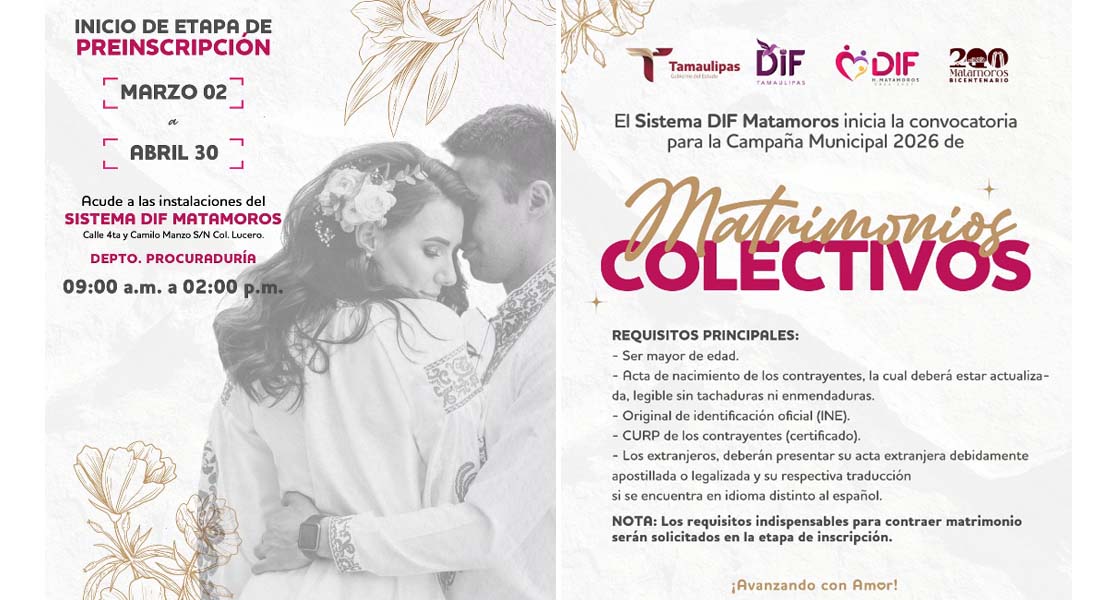 Matamoros, Tam.- El Sistema DIF Matamoros que encabeza la Lic. Ana Ariceaga de Granados en coordinación con el Sistema DIF Estatal, abren la convocatoria dirigida a todas las parejas interesadas en contraer nupcias y formar parte de la Campaña Municipal de “Matrimonios Colectivos 2026”.