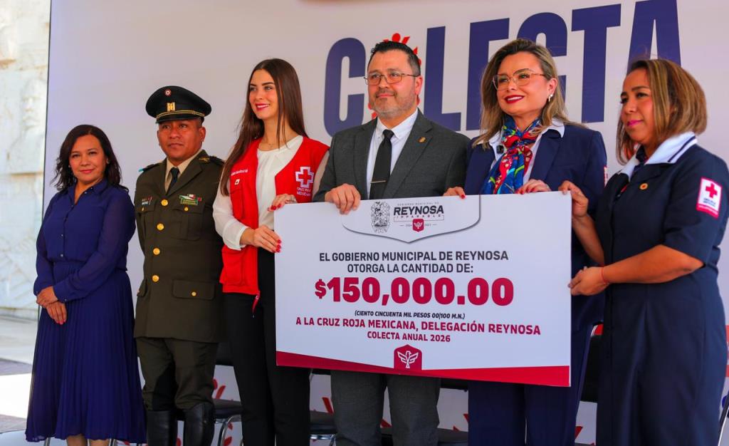 Reynosa, Tam.- El Gobierno del Alcalde Carlos Peña Ortiz entregó un cheque por 150,000.00 Pesos a la Cruz Roja Mexicana, Delegación Reynosa, en un evento en el marco de los 116 años de la Cruz Roja, que fue representado por el Secretario del Ayuntamiento, Antonio Joaquín de León Villareal y en el que participó la Presidenta del Voluntariado DIF-Reynosa, Alejandra Yelitza Garza, además Lizeth Dinora García Dueñas, Presidenta del Patronato del organismo civil.