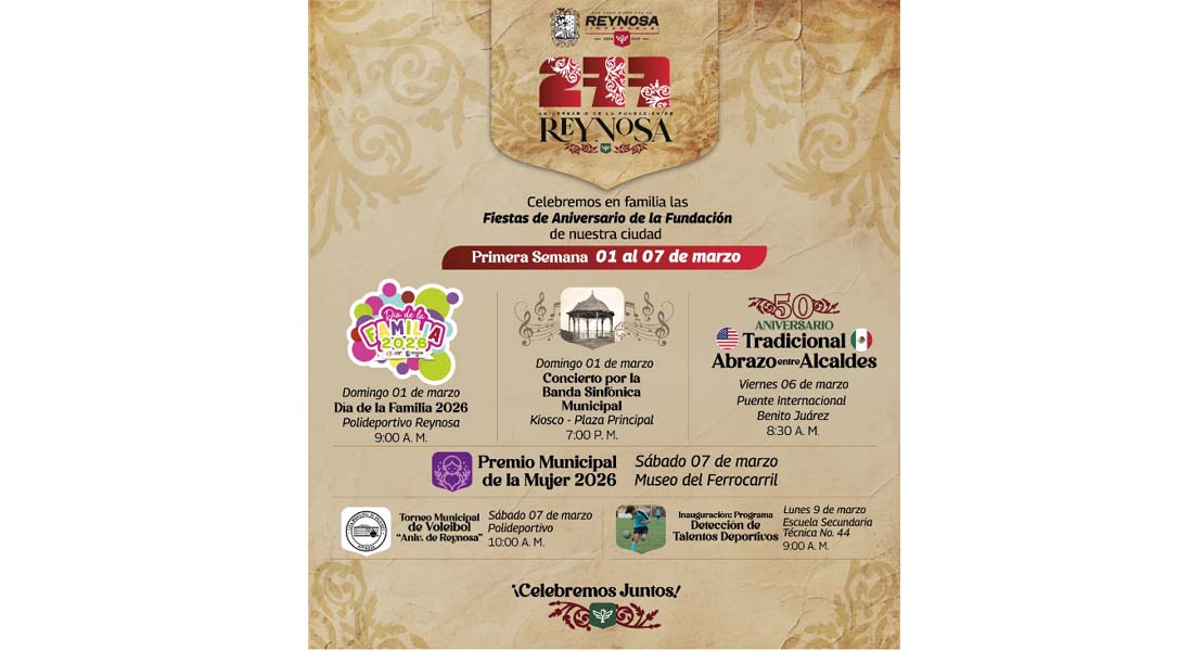 La mañana del Sábado 7 será inaugurado el Torneo Municipal de Voleibol «Aniversario de Reynosa», a las 10:00 A. M. en el Polideportivo y a las 7:00 P. M. será entregado el Premio Municipal de la Mujer en el Museo del Ferrocarril. Para el día lunes 9, la Secundaria Técnica 44 será escenario del programa Detección de Talentos Deportivos, a las 9:00 A. M.