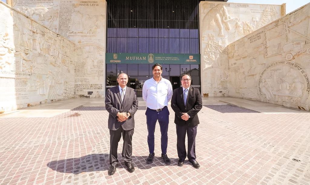 Reynosa, Tam.- El Presidente Municipal Carlos Peña Ortiz recibió al Cónsul de Guatemala en McAllen, Texas, Rudy Monterroso, a quien guió por el Museo del Ferrocarril, Historia, Arte y Maquila, MUFHAM, un acervo que refleja el orgullo y carácter de la gente de nuestra ciudad.