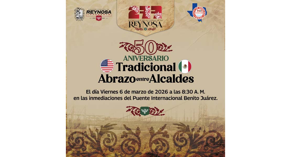 El viernes 6 de marzo será celebrado el Tradicional Abrazo, en las inmediaciones del puente internacional Benito Juárez, un acto que simboliza la amistad, la cooperación binacional pero sobre todo la amistad, la hermandad de las familias unidas por el río Bravo o río Grande y sus tradiciones.