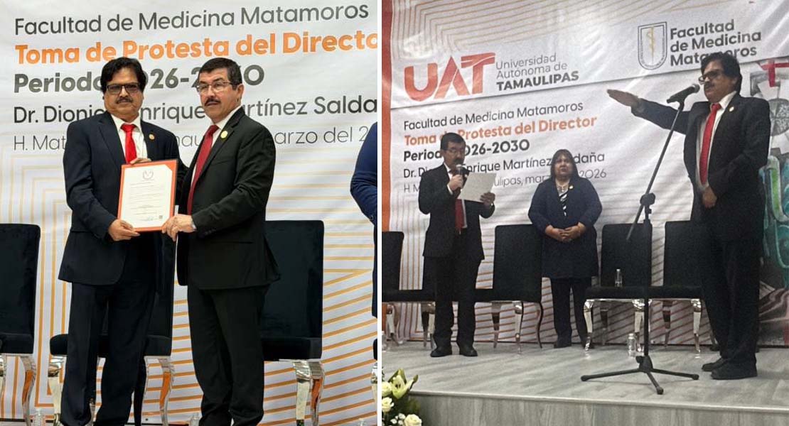 Matamoros, Tam.- Reiterando el compromiso de fortalecer la calidad educativa y consolidar el liderazgo institucional, el rector de la Universidad Autónoma de Tamaulipas (UAT), Dámaso Anaya Alvarado, encabezó la toma de protesta del Dr. Dionisio Enrique Martínez Saldaña como director de la Facultad de Medicina Matamoros para el periodo 2026-2030.