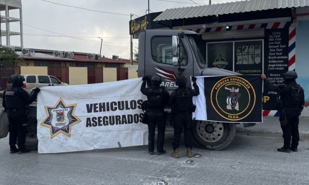 Reynosa, Tamaulipas.- Personal de las Fuerzas Especiales de la Guardia Estatal (FEGE) aseguró un tractocamión presuntamente utilizado para dañar infraestructura del sistema de videovigilancia, tras atender un reporte emitido por el C5.