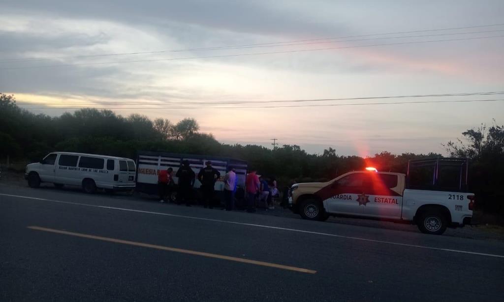 Durante recorridos de seguridad y vigilancia, detectaron dos unidades detenidas a la orilla de la vía que viajaban de Reynosa a Llera en las que viajaban 15 personas procedentes de una iglesia cuando una llanta del remolque que transportaban se reventó, obligándolos a detener su marcha.