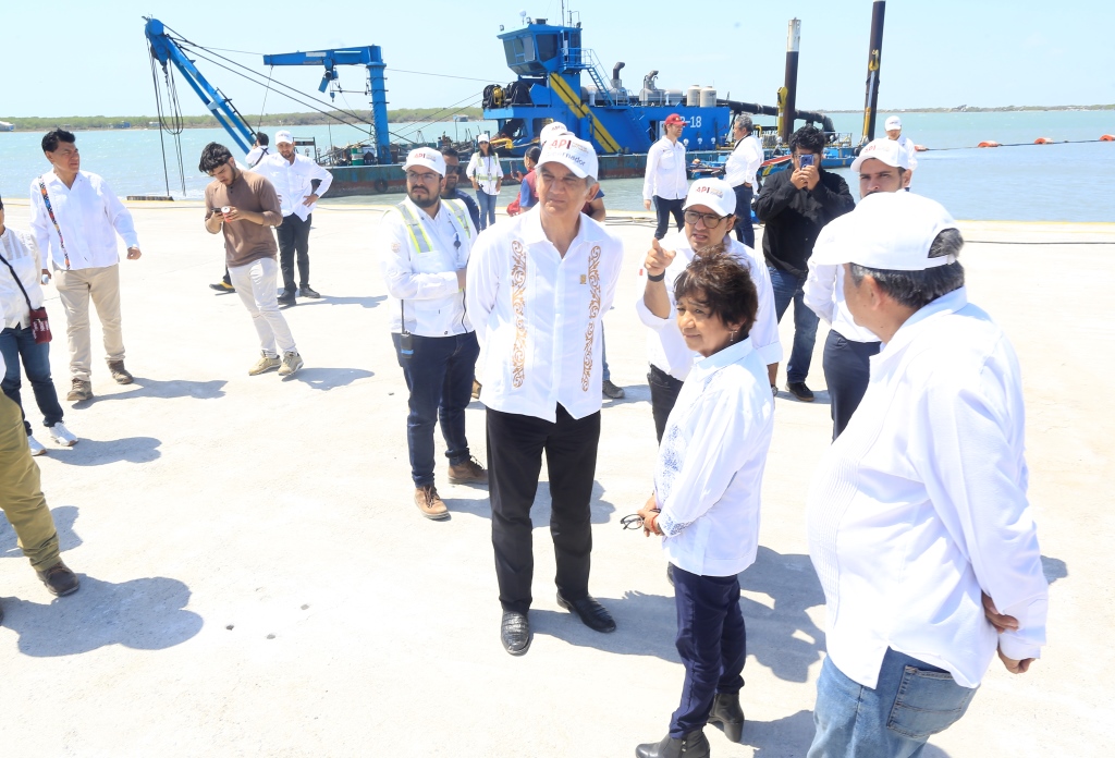 En la zona del muelle, supervisaron los trabajos que realiza la draga Montebello ADR-18, la cual cuenta con un tubo de 2 kilómetros de extensión, de 24 pulgadas de diámetro, con una capacidad de bombeo de 7 mil metros cúbicos por turno.