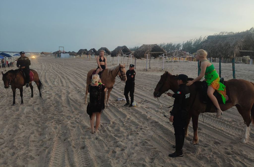 Soto la Marina, Tamaulipas.- En el marco del operativo Semana Santa 2026, caballos y jinetes del Agrupamiento Montado de la Guardia Estatal realizan labores de vigilancia y proximidad en la Playa La Pesca, ubicada en el municipio de Soto la Marina.