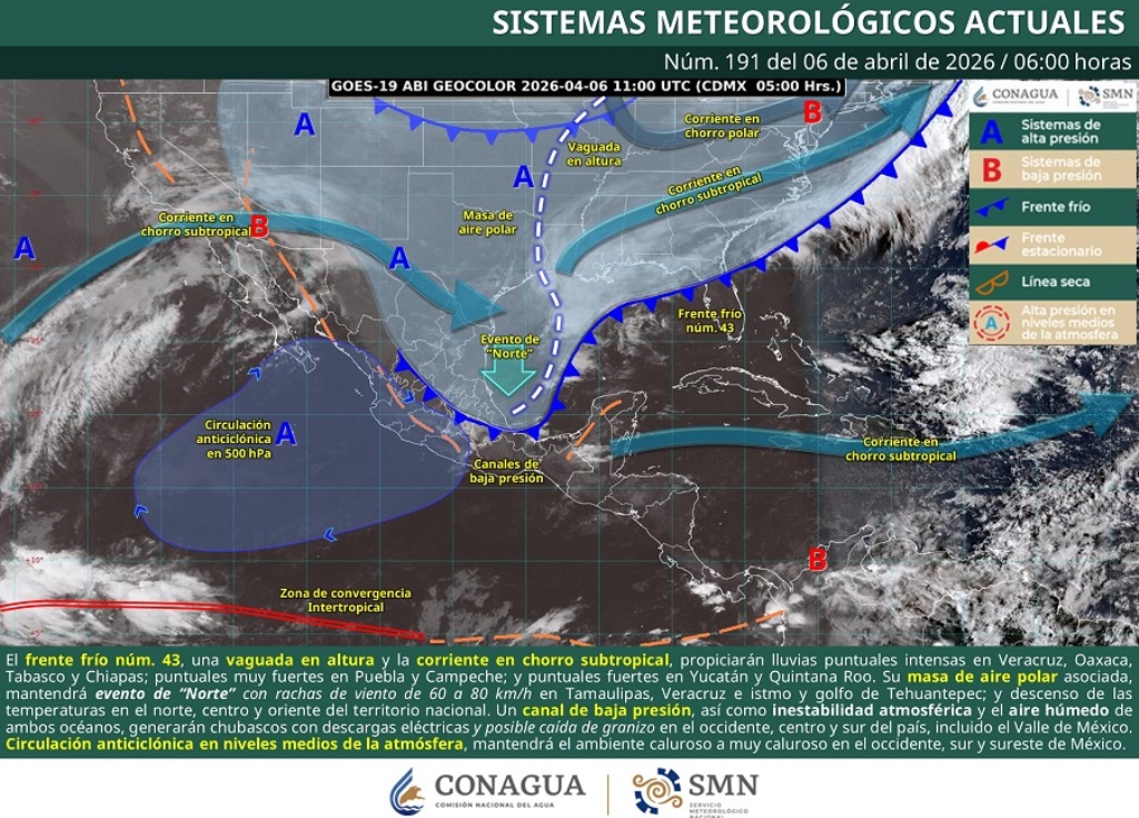 Reynosa, Tam.- El Frente Frío Número 43 dejó para esta región temperaturas agradables, la máxima para hoy lunes 6 de abril será de 24° Centígrados y mínima de 14°; con ligero cambio para el día martes 7 con 28° máxima y mínima de 18°; con ausencia de probabilidad de lluvias.