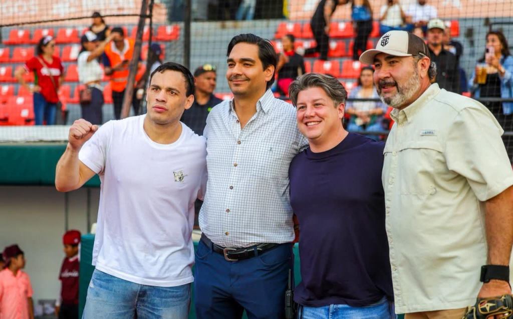 Reynosa, Tam.- El Presidente Municipal Carlos Peña Ortiz asistió al segundo juego de la Serie Charros de Jalisco contra Sultanes de Monterrey, donde el boxeador Julio César Chávez Jr lanzó la primera bola para dar inicio al partido de pretemporada de la Liga Mexicana de Beisbol «AAA» en Reynosa.