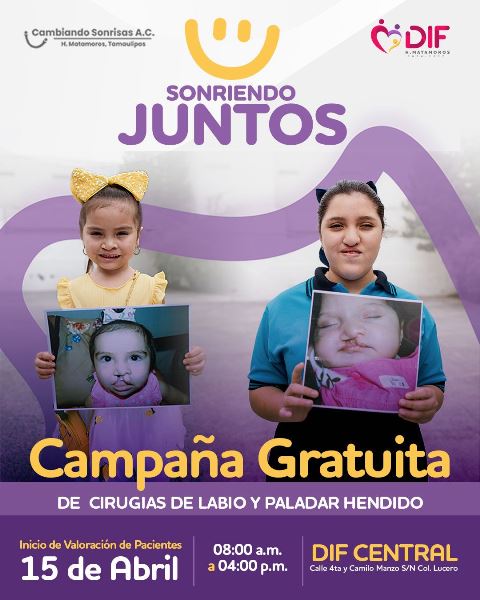 Matamoros, Tam.- Trabajando bajo una visión de responsabilidad social y con el firme compromiso de mejorar la calidad de vida de las familias, el Sistema DIF Matamoros, presidido por la Lic. Ana Ariceaga de Granados, en coordinación con la Asociación “Cambiando Sonrisas”, da inicio a la etapa de valoración de la campaña permanente de cirugías de labio y paladar hendido “Sonriendo Juntos”, invitando a la población a beneficiarse con estas acciones.