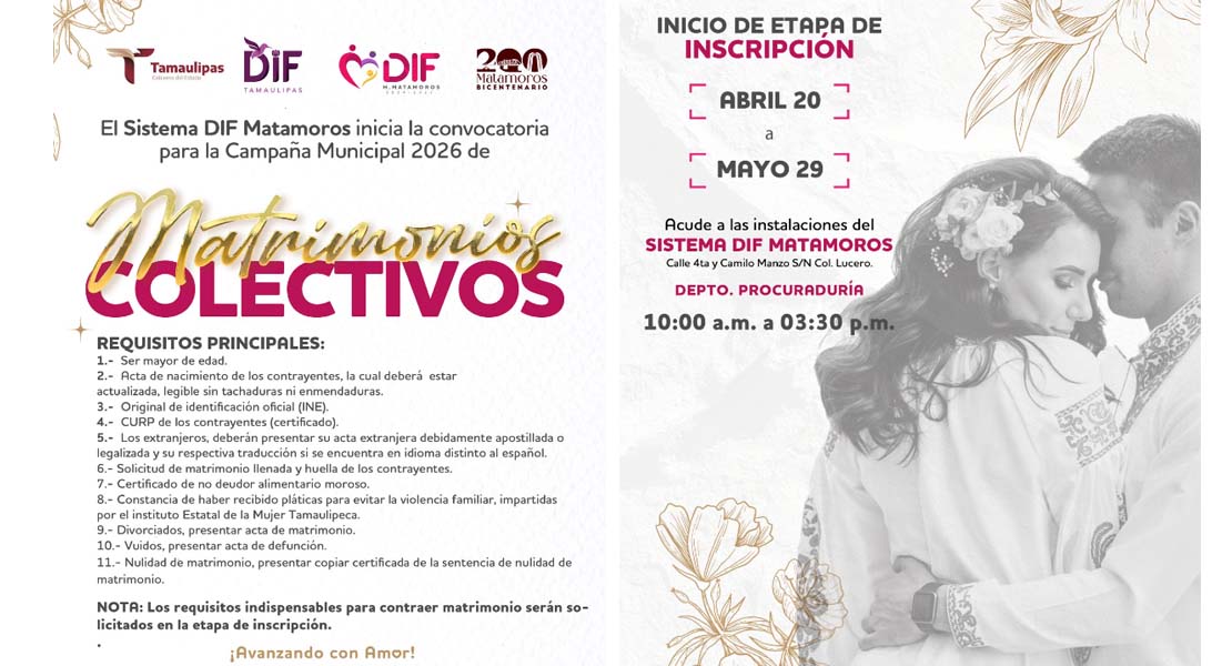 Matamoros, Tam.- El Sistema DIF Matamoros que encabeza la Lic. Ana Ariceaga de Granados, continúa haciendo la invitación a todas las parejas interesadas en formalizar su unión, a formar parte de la Campaña Municipal de Matrimonios Colectivos 2025.
