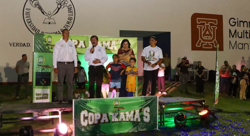 Ciudad Mante, Tam.- En el marco del fortalecimiento de la vinculación social y el impulso a la formación integral de la niñez y juventud, el rector de la Universidad Autónoma de Tamaulipas (UAT), Dámaso Anaya Alvarado, inauguró la Copa Kama’s de futbol la noche de este viernes 17 de abril en las instalaciones del Gimnasio Multidisciplinario Mante, espacio universitario que fungió como sede del evento.