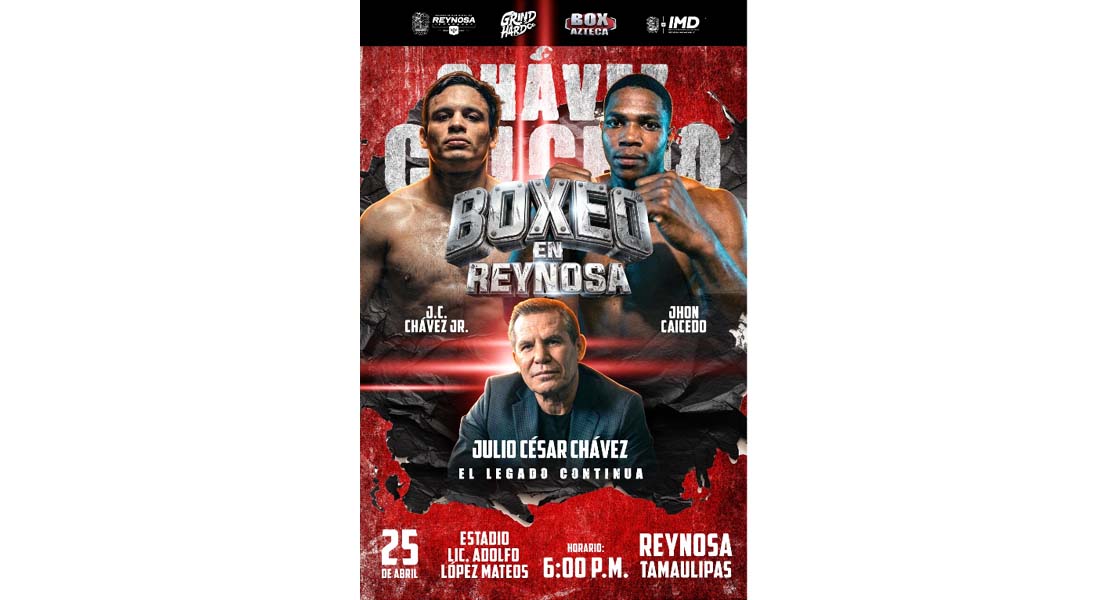 Reynosa, Tam.- El Presidente Municipal Carlos Peña Ortiz invita a los aficionados de Reynosa y del Valle del Sur de Texas a la función estelar de Boxeo Profesional del púgil mexicano Julio César Chávez Jr., quien el próximo 25 de abril subirá al ring para enfrentarse al colombiano Jhon Caicedo teniendo como escenario el majestuoso parque Adolfo Lopez Mateos, donde habrá 17 peleas más.