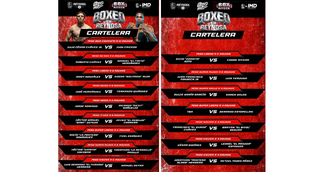 La pelea estelar entre Julio César Chávez Jr y Jhon Caicedo estará enmarcada con otros 15 combates sobre el ring, entre los que se cuentan encuentros de chicas boxeadoras, y de púgiles reynosenses; esta es la cartelera completa del próximo 25 de abril:
