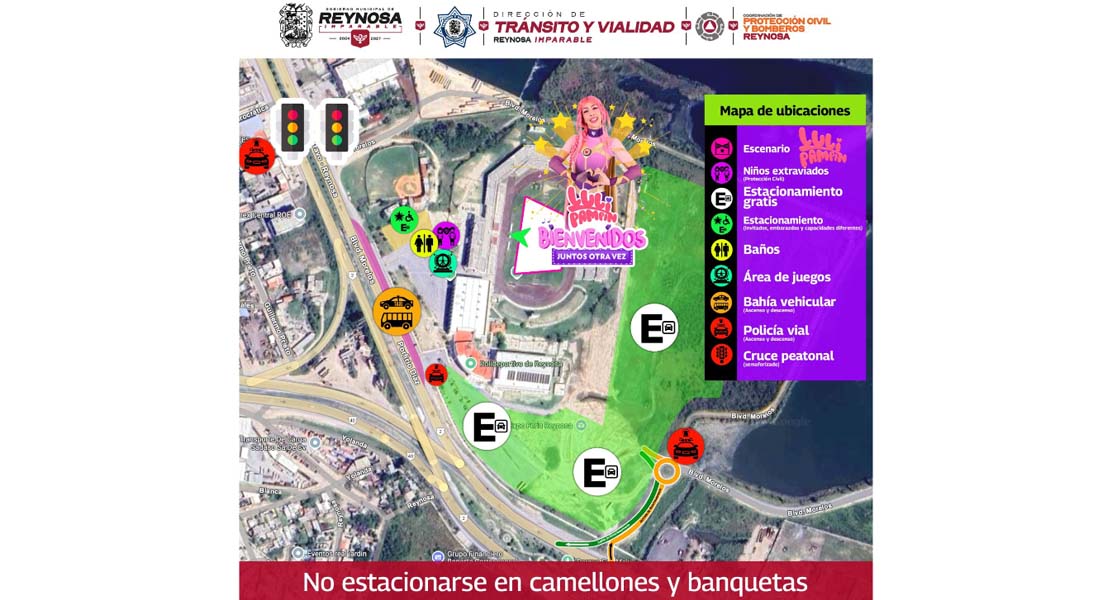 Reynosa, Tam.- Ubica tus accesos para el evento de Luli Pampín en Reynosa, para que tu entrada y salida sea rápida y segura, te invitamos a revisar el croquis y seguir estas recomendaciones: