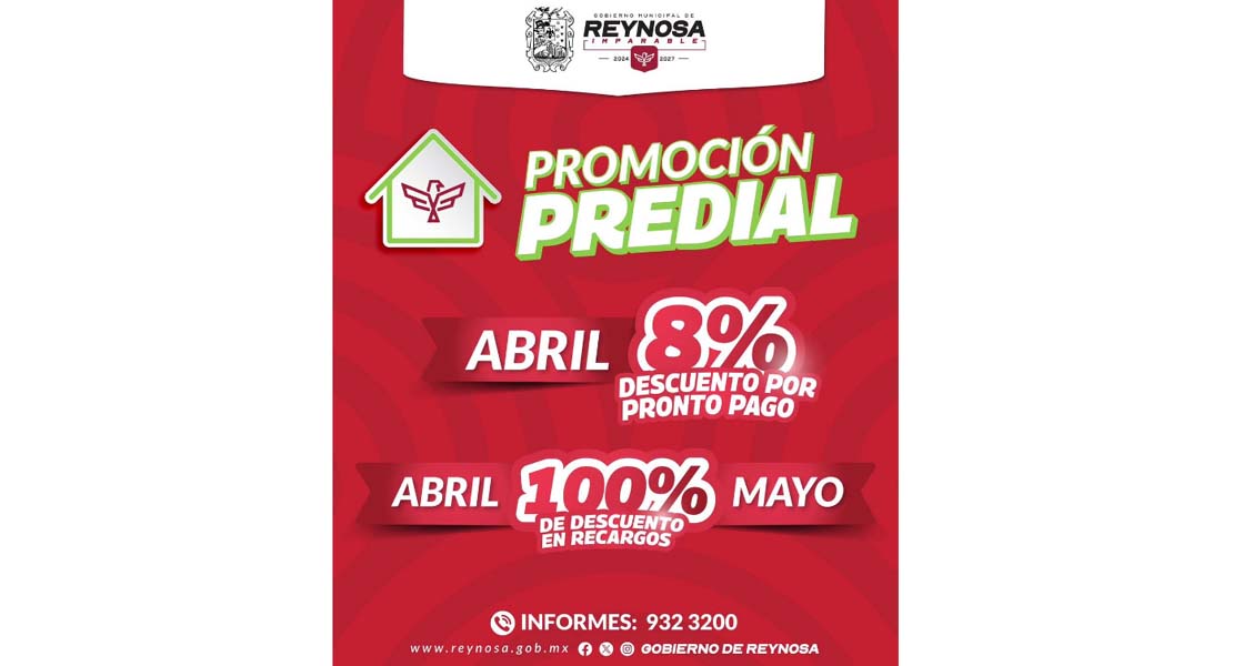Reynosa, Tam.- Sigue vigente el descuento del 100% de recargos del Impuesto Predial en Reynosa, aprovecha para pagar tu rezago con un gasto reducido y tener tu propiedad al día con este beneficio durante abril y mayo y últimos días del 8% de descuento directo al impuesto.