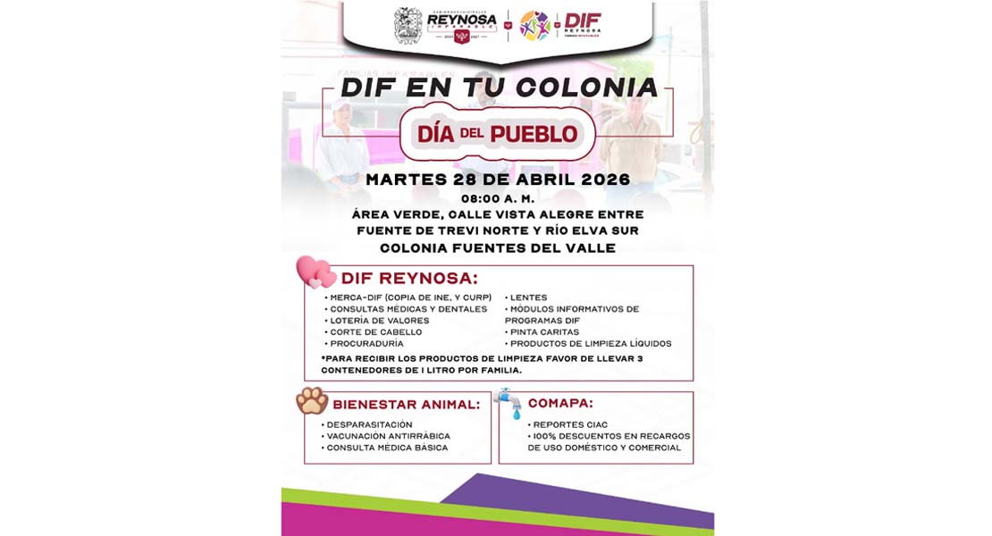 Reynosa, Tam.- Con el objetivo de acercar apoyos y atención directa a las familias, el Sistema DIF-Reynosa que preside Carlos Luis Peña Garza, realizará la brigada “DIF en Tu Colonia” este martes 28 de abril en la colonia Fuentes del Valle, donde se ofrecerán diversos servicios de manera gratuita.