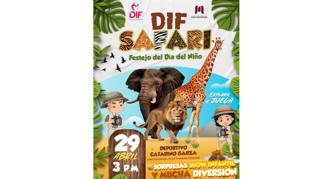 DIF Safari se llevará a cabo el próximo miércoles 29 de abril, a partir de las 3:00 de la tarde, en el Deportivo Catarino Garza, ubicado en calle 23 de Febrero s/n, colonia Ampliación Solidaridad. Durante el evento, las familias podrán disfrutar de sorpresas, show infantil y diversas actividades recreativas.