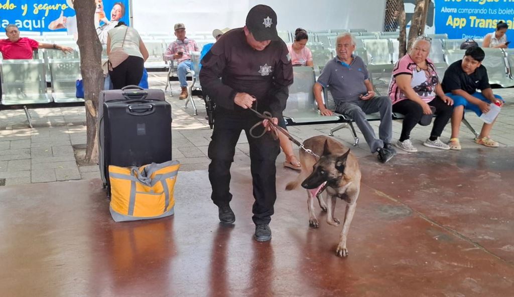 Durante la jornada, el binomio canino integrado por el ejemplar “Flash”, especializado en la detección de narcóticos, llevó a cabo recorridos de inspección en pasillos, salas de espera, andenes y áreas comunes de la terminal.