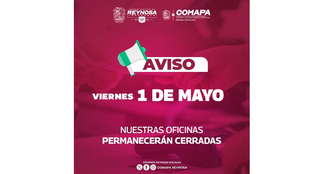 Reynosa, Tam.- Con motivo del Día del Trabajo y en cumplimiento con la disposición oficial, la Comisión Municipal de Agua Potable y Alcantarillado de Reynosa informa a sus usuarios que este viernes 1 de mayo, las oficinas del organismo permanecerán cerradas.