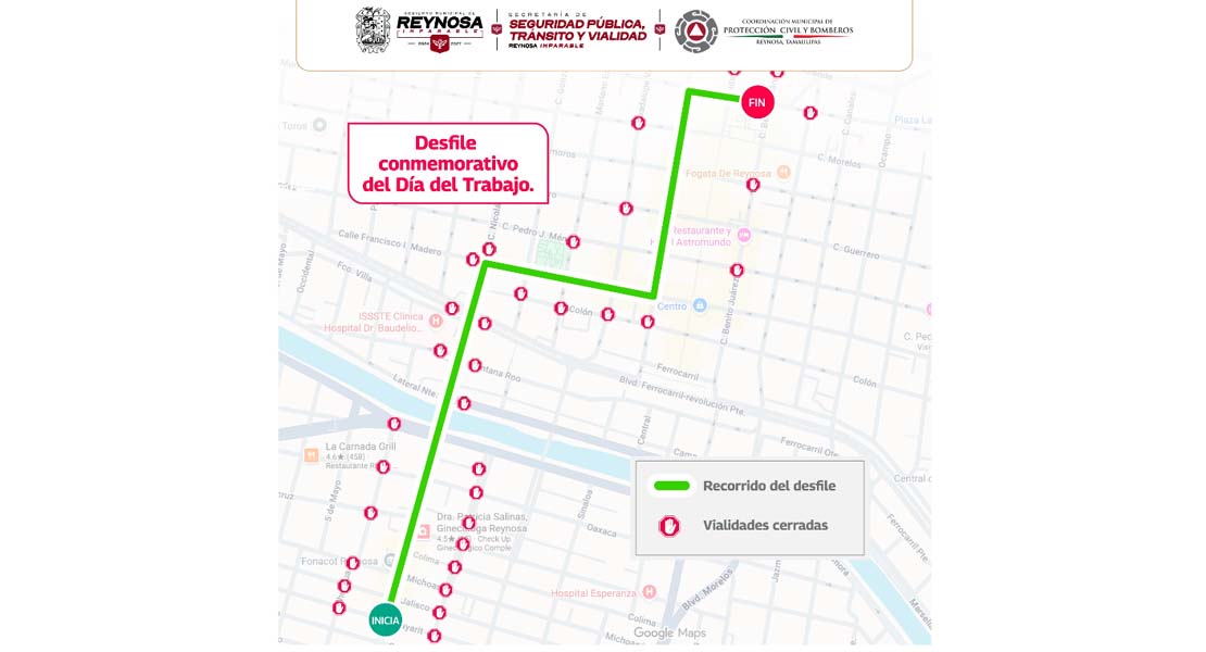 Reynosa, Tam.- Este 1 de mayo se llevará a cabo el tradicional desfile en conmemoración al Día del Trabajo, iniciando a las 09:00 horas, por lo que el Gobierno Municipal de Reynosa deberá realizar cierre de vialidades en las siguientes avenidas y se irá reanudando la circulación conforme vaya avanzando: