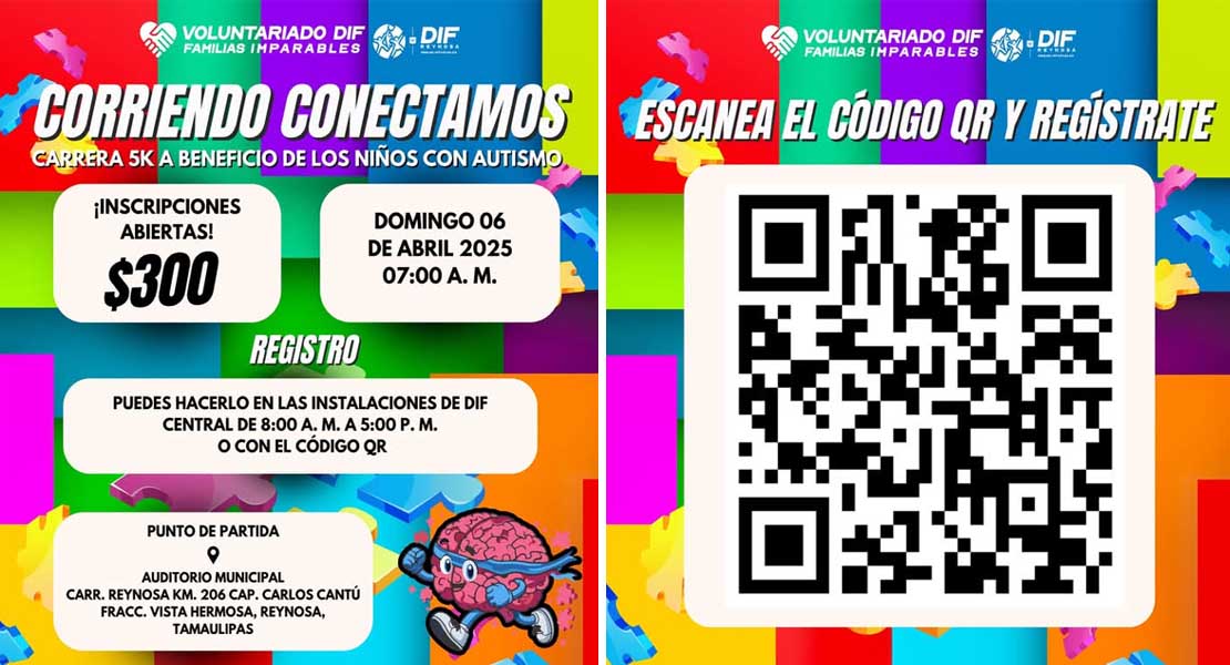 Reynosa, Tam.- El Sistema DIF Reynosa, que preside Carlos Luis Peña Garza y el Voluntariado DIF, que encabeza Alejandra Yelitza Garza, invitan a la comunidad a participar en la carrera “Corriendo Conectamos”, un evento deportivo con causa.